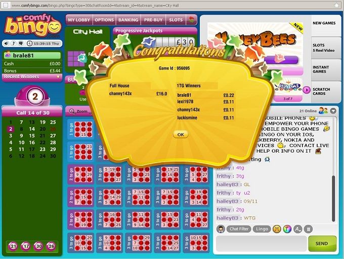 Playing Bingo and being comfy are two things that certainly go together so Comfy Bingo was the site I had to check out. Another thing that I would like to do is to visit London and bingo rooms named Big Ben, London Hall, Buckingham Palace and City Hall certainly took me there. I was eager to play but all games have already started.