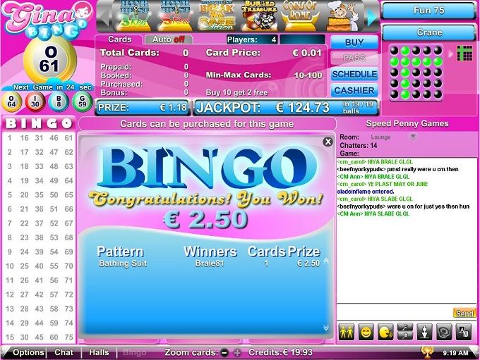 I was back to play bingo games at one of my favorite bingo sites – Gina Bingo. I had some great memories from playing here and I’m always happy to be back. I was feeling great and I decided to play in Speed Penny Bingo room; there were just around 10 players and I thought I had good chances. I went into the room in the middle of the game, bought 100 tickets and got 20 bonus ones, and before I knew it I won in that game. I was very surprised. The pattern was a Bathing Suite and the prize €2.50. It was a nice start so I stayed in the same room for more games.