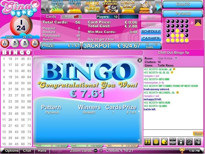 Today, I decided to come back to one of my dearest bingo sites – Gina Bingo. Without much delay I entered the Club 75 online bingo room but I had to wait a few moments for the previous game to finish. Finally, when the time has come, I started the first game with 56 cards; for 48 tickets I bought, I got eight for free. The first game had a Double Inside Lines pattern and everything went on pretty smoothly. Unfortunately, in the middle of the game I got disconnected; I panicked, of course, because I paid for the tickets but after I reconnected, the game continued without any problems. I finished that game having two cards with one number to go.