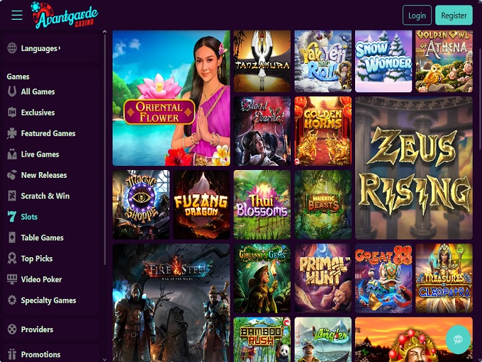 Slots: Oriental Flowers, Snow Wonder, The Golden Owl of Athena, Zeus Rising, Thai Blossoms, Majestic Beasts, Giovanni's Gems, Great 88, Take the Vault, Prosperity Pot 88, Mega Gems, Wicked Ways, Gold Tiger Ascent, Hearts Desire, Tycoons, Lair of the White Tiger, Gold Heist, Sultan of Spins, Candy Clusters, El Bandito, Funky Frogs, Hooked on Fishing, and numerous more.