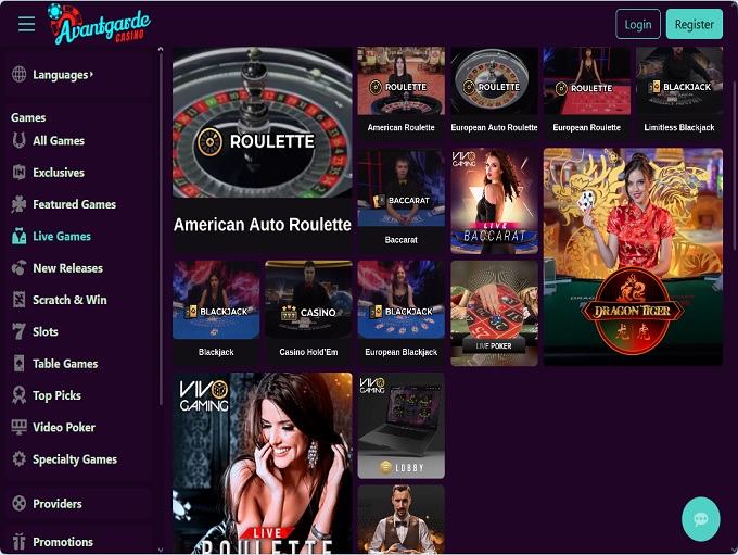 The live casino lobby isn't nearly as impressive as the one with slots, since it only has a few games, including European Auto Roulette, Casino Hold'em, Baccarat, American Auto Roulette, Limitless Blackjack, European Blackjack, and several more.